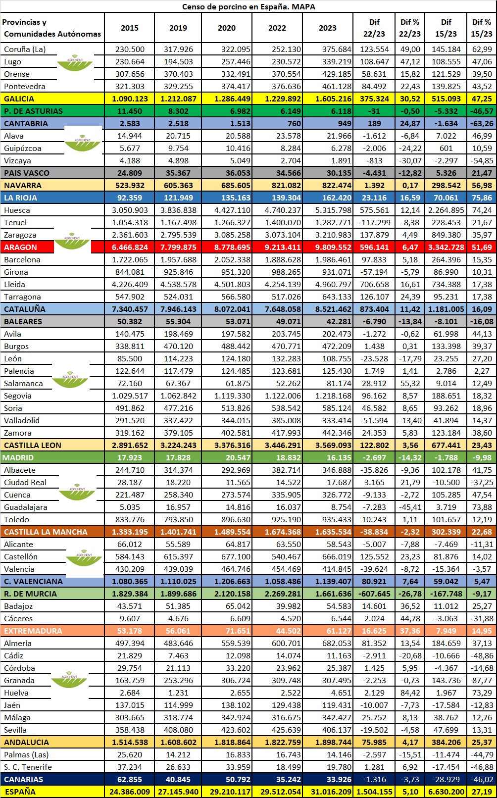 El censo de porcino blanco en España, durante 2023, crece un 5,10% hasta alcanzar los 31 millones de animales, ganado 1,5 millones.